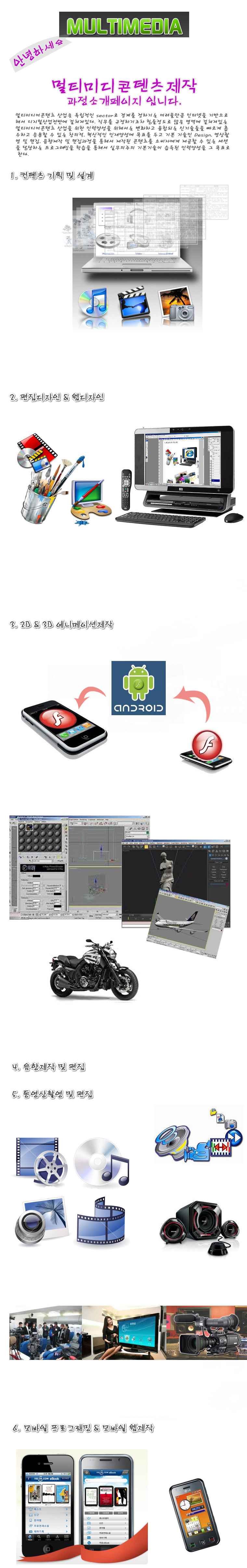 멀티미디어콘텐츠 산업은 독립적인 sector로 경계를 정하기는 어려울만큼 인터넷을 기반으로해서 디지털산업전반에 걸쳐져있다. 직무를 규정하기조차 힘들정도로 많은 영역에 걸쳐져있는 멀티미디어콘텐츠 산업을 위한 인력양성을 위해서는 변화하고 융합되는 신기술들을 빠르게 흡수하고 응용할 수 있는 창의적, 혁신적인 인재양성에 목표를 두고 기본 기술인 Design, 영상촬영 및 편집, 음향제작 및 편집과정을 통해서 제작된 콘텐츠를 소비자에게 제공할 수 있는 세션을 담당하는 프로그래밍을 학습을 통해서 실무의주의 기본기술이 습득된 인력양성을 그 목표로 한다.